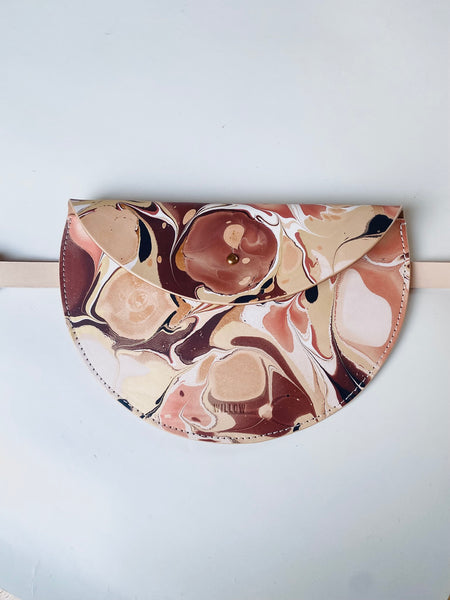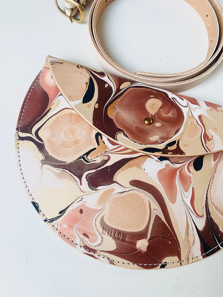 These beautiful statement halfmoon bags are hand marbled, which is the technique of floating paints and dyes on the surface of water, to produce a one-of-a-kind pattern. A truly unique individual piece.