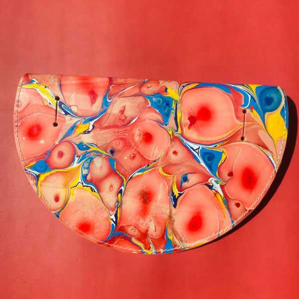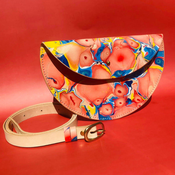 These beautiful statement halfmoon bags are hand marbled, which is the technique of floating paints and dyes on the surface of water, to produce a one-of-a-kind pattern. A truly unique individual piece.
