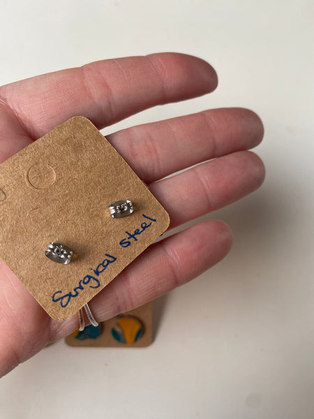 Unique handmade marbled leather earrings with surgical steel stud and butterfly.